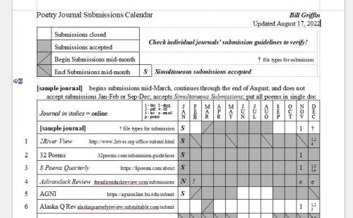Poetry Submissions Calendar – UPDATE AUGUST, 2022